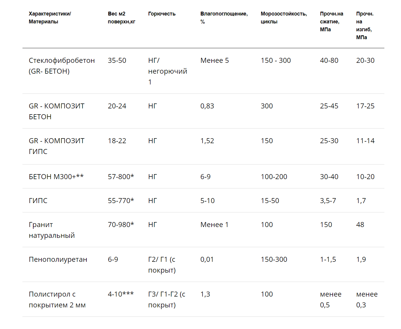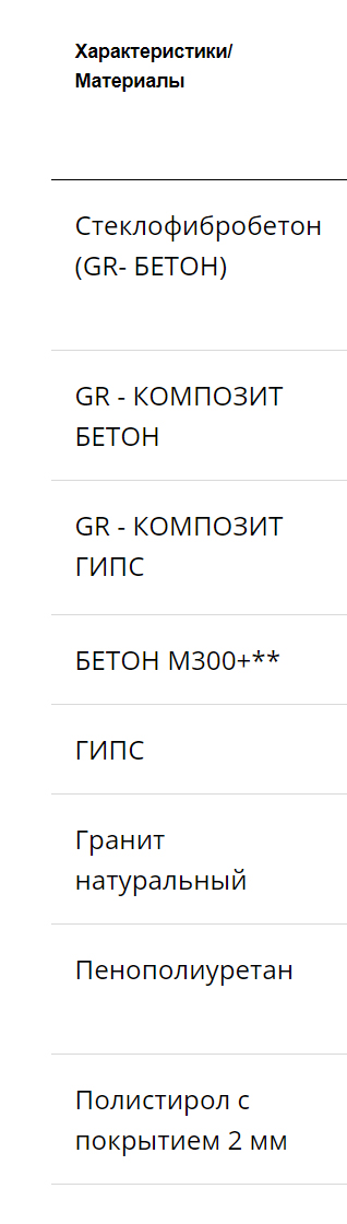 Бетон композит влагостоек в отличие от гипса, и более устойчив к влаге по сравнению с обычным бетоном. Увеличена также морозостойкость, что увеличивает срок эксплуатации изделий.