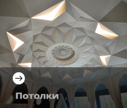 Могут быть отлиты практически в любую сложную форму: стеновые панели, элементы потолков, колонны, барельефы, купола, карнизы, молдинги, камины.